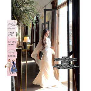 安妮不火银戒吻痕气质鱼骨雪纺女神拖尾裙女新款微胖大码半透视裙