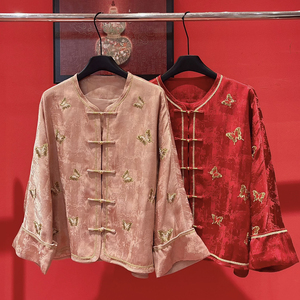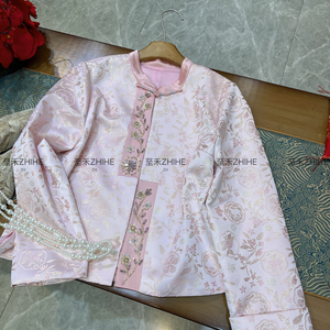 春上新极简大牌老钱新中式人丝宋锦钉珠盘扣短外套(含30%真丝)