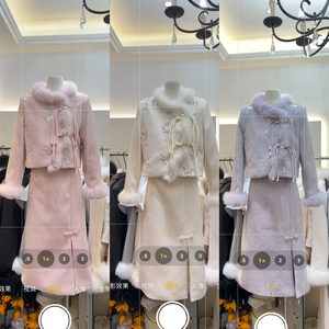 冬上新新中式国风气质狐狸毛珠边盘扣设计羽绒服+半身裙套装