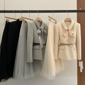 冬上新轻奢羊毛外套+同色丝巾A字裙纱裙半身裙套装(含100%羊毛)