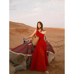 法式辣妹纯欲花朵斜肩红色连衣裙女西北敦煌沙漠旅游穿搭度假长裙