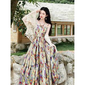 法式高级设计感油画印花碎花连衣裙海边旅游度假风长裙两件套装女