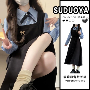 2024早初秋新款黑色假两件长袖连衣裙小个子女法式学院风吊带长裙