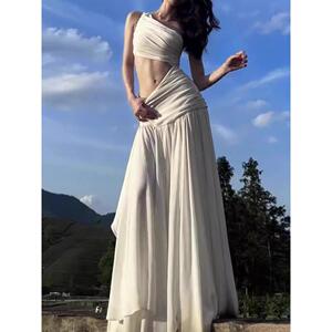 法式白色镂空斜肩连衣裙女夏季高级感海边度假气质显瘦小众长裙子