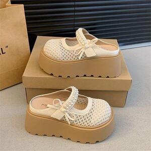 仙女风蝴蝶结增高厚底包头拖鞋女2025夏季新款甜美百搭网纱半拖鞋