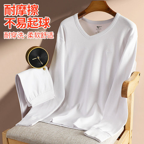 七匹狼男士全棉打底内衣纯棉秋衣秋裤套装V领鸡心领纯白色保暖衣