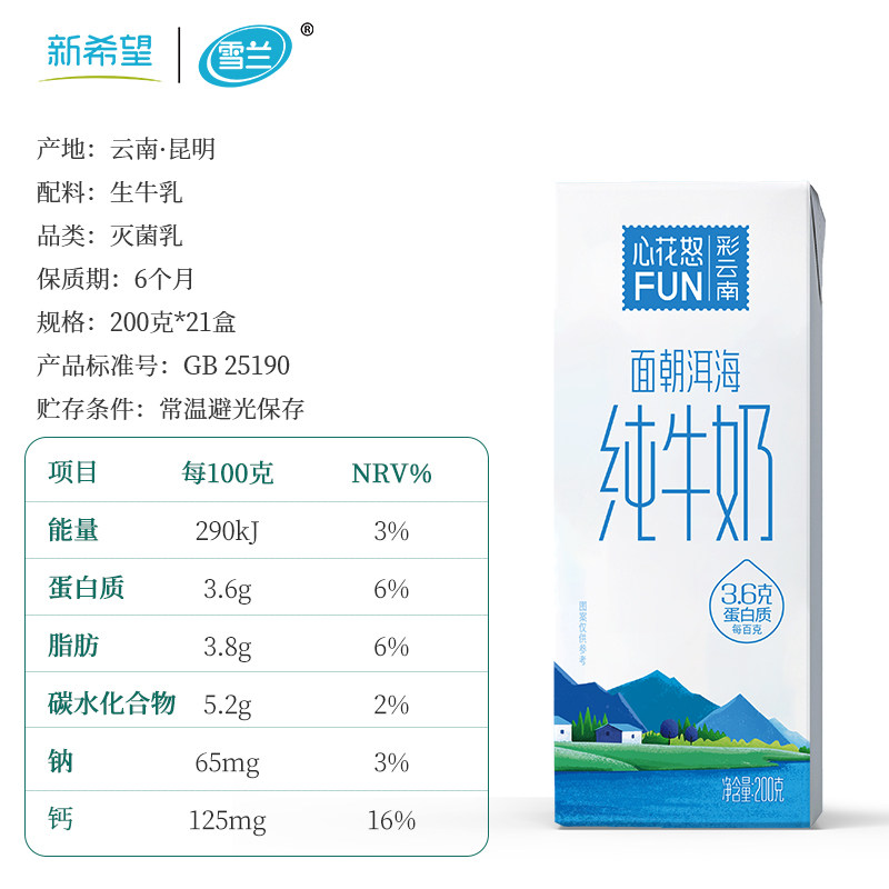 新希望•雪兰云南风景纯牛奶200g*21盒 下拉!进秒杀29.8亓 折1.4亓/盒,来自云南高原牧场的牛奶! 喝起来自带一丝清甜!奶味特别浓!喝完一盒还想喝!